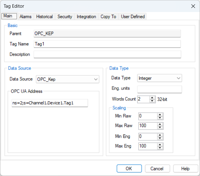 Build (Stream Explorer)TagsMain configurationOPC UA Addressing KEP Server Example Example: KepServer Tag Editor