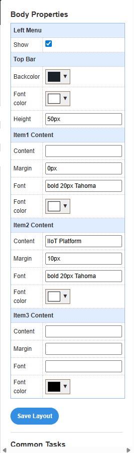 The Layout Properties interface allows you to configure the overall appearance and behavior of your Stream Platform dashboard. This includes settings for the main body, navigation menu, top bar, and content areas.