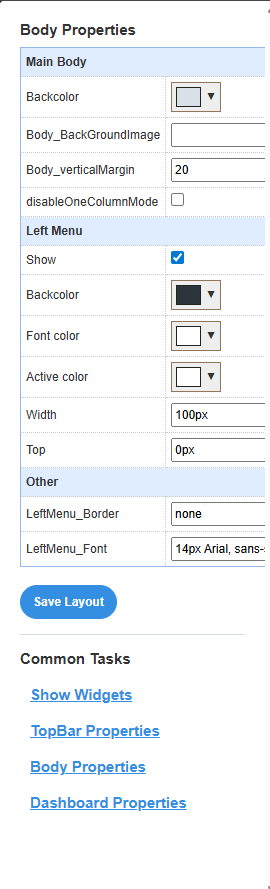 The Body Properties interface is organized into several sections, each controlling different aspects of your dashboard layout.